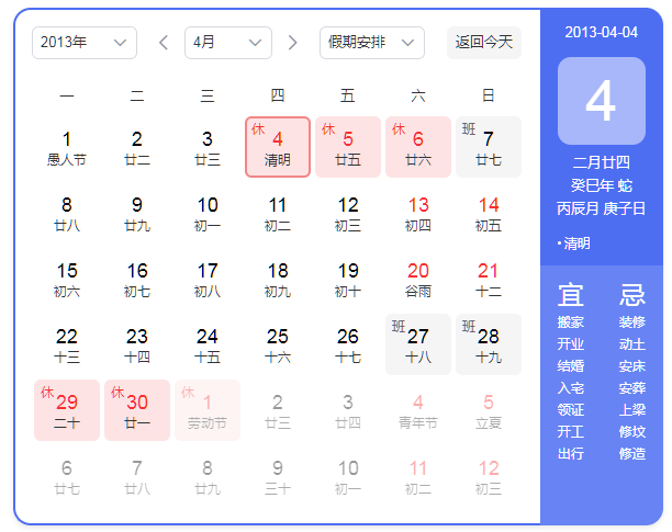 4月4日至6日放假調(diào)休,共3天。4月7日(星期日)上班。