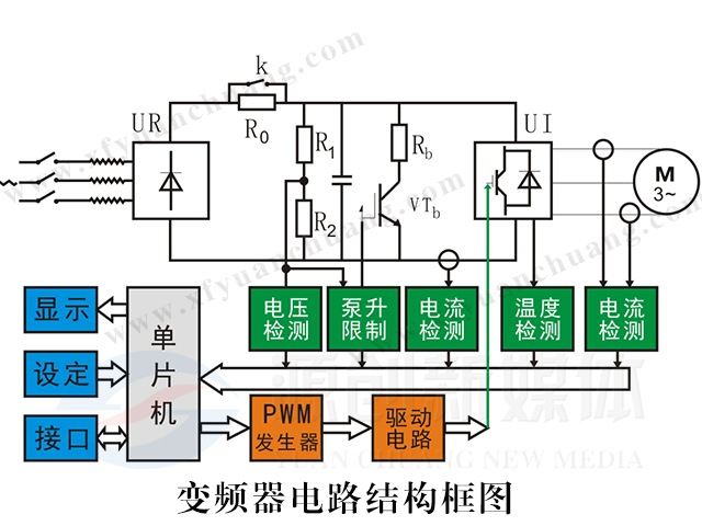 由整流,濾波,逆變,驅動以及微處理單元構成。一般通過驅動IGBT的開斷實現對輸出電壓與頻率的調整。實現調速與節能的功能。