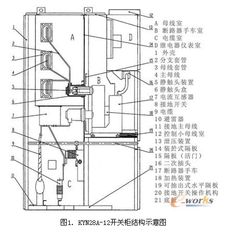 交流金屬封閉開關設備》設計。整體由柜體和中置式可抽出部件(即手車)兩大部分組成,開關柜的結構示意圖見圖 1