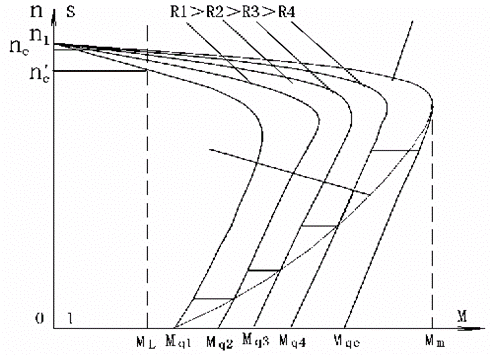 (1)圖中起動曲線與橫坐標軸(電磁軸)及縱坐標軸(轉速軸或轉差率軸)包絡的面積大小,反映了起動過程平均電磁轉矩大小,二者成正比關系。