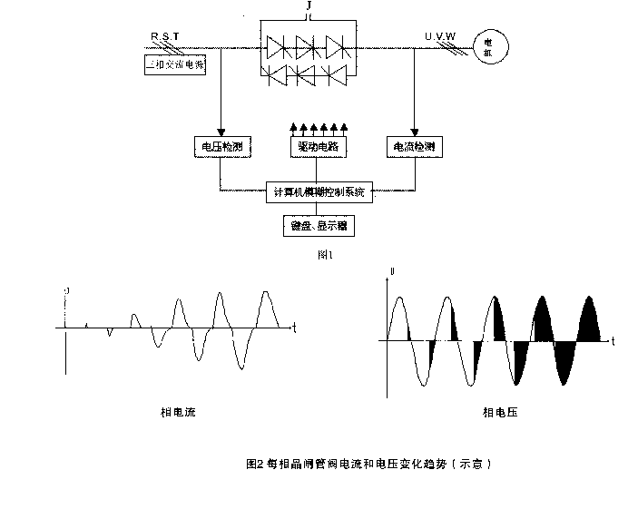 當(dāng)起動(dòng)完成后,三相旁路接觸器J自動(dòng)吸合,電動(dòng)機(jī)投入電網(wǎng)運(yùn)行(見(jiàn)圖1)。輸入/輸出電壓波形和電流變化的波形(見(jiàn)圖2)。
