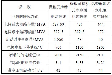 (1) 自藕變壓器啟動方式的主要優點在于后期不需要維護, 而且容量可以設計得很大, 在國外也被廣泛使用, 并且占地面積也相對較小, 需要的土建投資成本比較低, 但設備本身的投資成本相對較高; 缺點就是自藕變壓器只有3 個端頭, 端電壓可調節范圍有限, 啟動時產生的一個二次沖擊會對電網和設備造成沖擊。