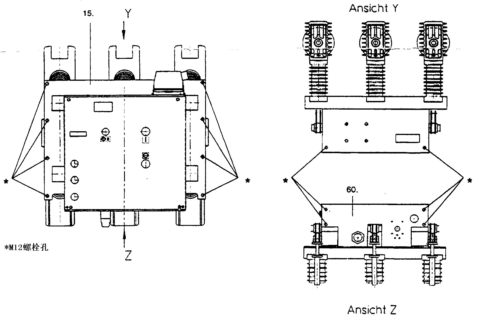 在柱狀板(15.)和機械柜(60.)上共有14個安裝孔適應(yīng)各種各樣的型號斷路器的安裝(圖3/1)。對于額定短路開斷電流≥50KA的源創(chuàng)電氣真空斷路器的安裝,我們推薦僅使用柱狀板。