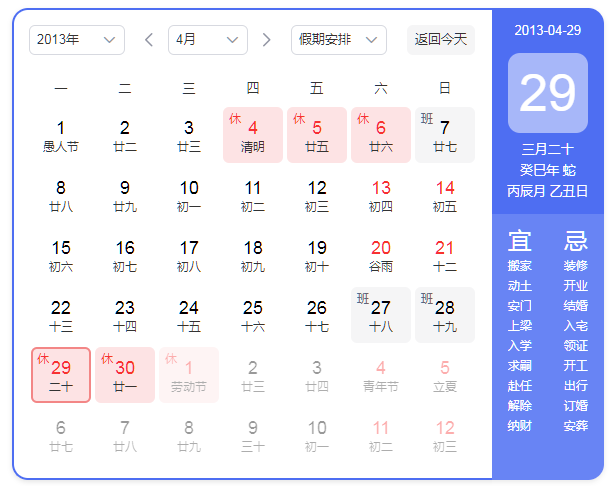 4月29日至5月1日放假調休,共3天。4月27日(星期六)、4月28日(星期日)上班。